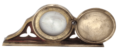 The inclinometer is 57/8" at the base and 2 7/16" tall with a circular chamber, 2 1/8" in diameter. When the chamber is half filled with a fluid it will indicate the angle at which the instrument is sitting. The chamber is closed with a "watchmakers' crimp seal." There is no way to replace lost fluid without removing the front scale, glass and crimp seal. All of the known versions of this inclinometer that have fluid still inside have had a hole drilled in an inconspicuous place in order to add fluid. This one has no fluid and no obvious access hole.